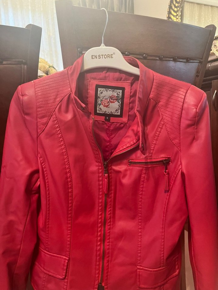 Parlak kırmızı biker deri ceket, çıtçıtlı yaka ve fermuarlı ön kısmı ile. İnce kesim, midi boy ve uzun kolludur.