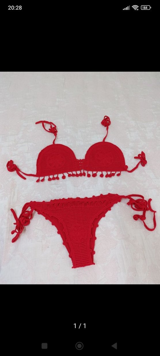 Kırmızı örgü, işlemeli, askılı mini bikini, bohem tarzda, sıkı oturan kesimiyle plaj için uygundur. ️