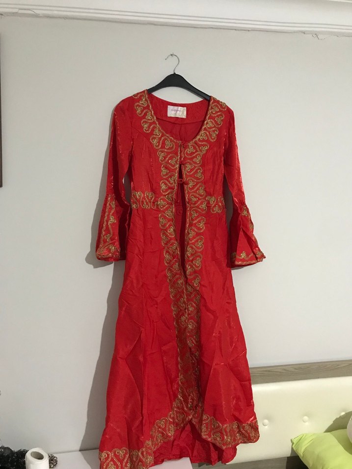 Parlak kırmızı renkte, nakış işlemeli, V yaka ve uzun kollu, bol kesim, drapeli uzun kına elbisesi. Düğünler için uygundur.