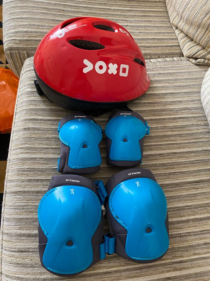 Kırmızı bisiklet kaskı, havalandırma delikleri ve beyaz baskılar içerir. Mavi diz ve dirsek koruyucuları cırt cırtlıdır.