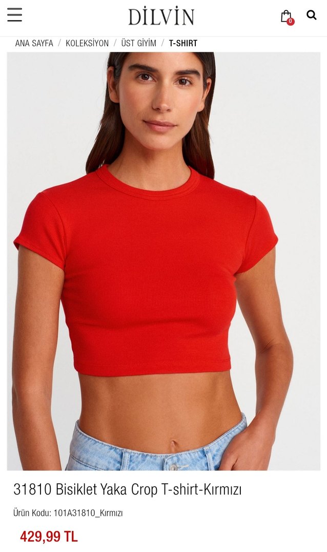 Kırmızı renkli, bisiklet yaka ve kısa kollu crop tişört, vücuda oturan kesimiyle spor ve şık bir görünüm sunar.