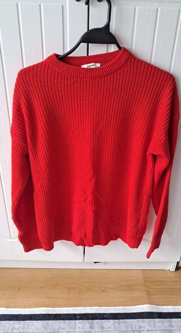 Bu kırmızı örgü kadın kazak, bisiklet yaka ve uzun kolludur. Rahat kesimi ve normal boyu ile günlük kullanıma uygun, renkli ve sokak stiline uygun bir parçadır.