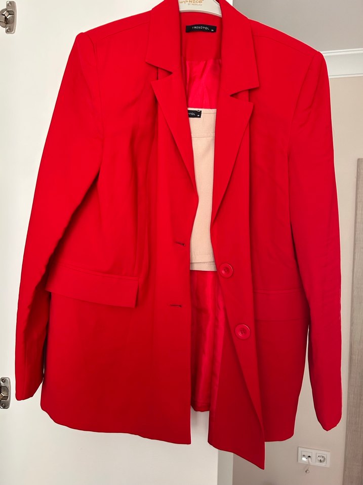 Düğmeli, kırmızı kadın blazer ceket, normal boy midi uzunlukta ve regular fit. Notched lapel yakalı ve parlak renkte, sentetik kumaştan üretilmiştir. Aynı özelliklerde pantolonu mevcuttur. İçindeki bluz hediye edecektir.