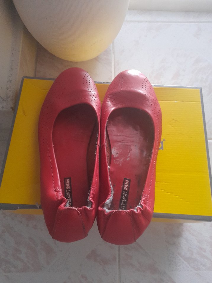 Kırmızı blok topuklu, kauçuk malzemeden yapılmış kadın babetleri. Minimalist tasarımıyla günlük kullanım için rahat ve şık.