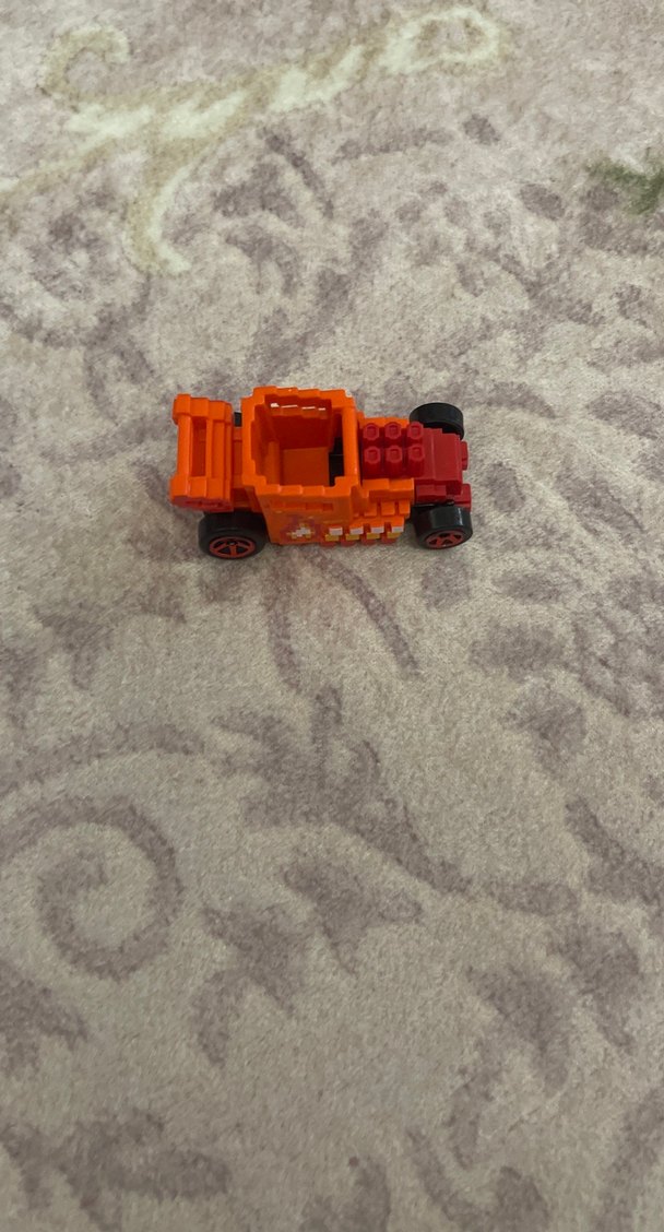 Kırmızı ve gri bloklardan oluşan küçük oyuncak araba, siyah ve kırmızı jantlı tekerleklere sahiptir.
