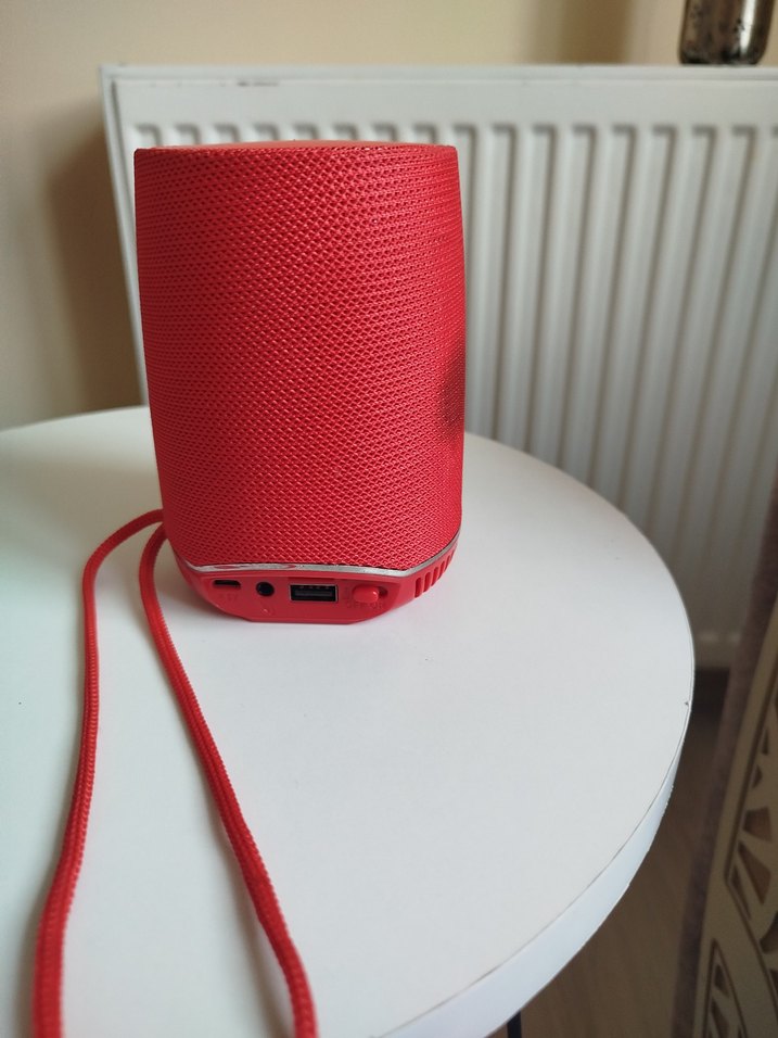 Kırmızı renkli, renkli örgü tasarıma sahip Bluetooth hoparlör, taşıma kayışı ile kablosuz ses sunar. sadece fotoğrafta görüldüğü gibi siyah boya lekesi var onun dışında bir problem yok.bBTS34