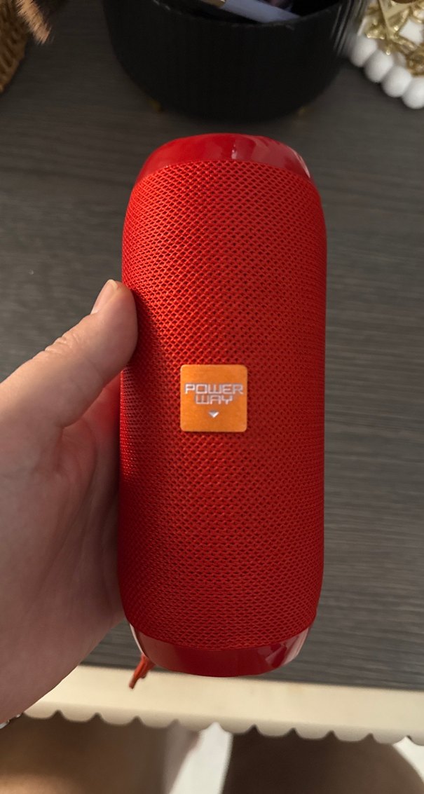 Kırmızı renkli, renkli tasarıma sahip Bluetooth hoparlör. Üzerinde "POWER" yazılı düğme bulunur.