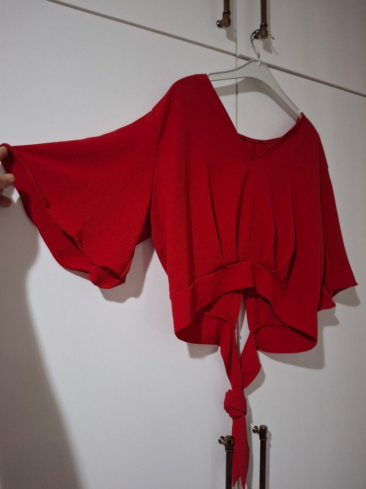kısa kollu, parlak kırmızı renkte, bol kesimli kadın bluz.