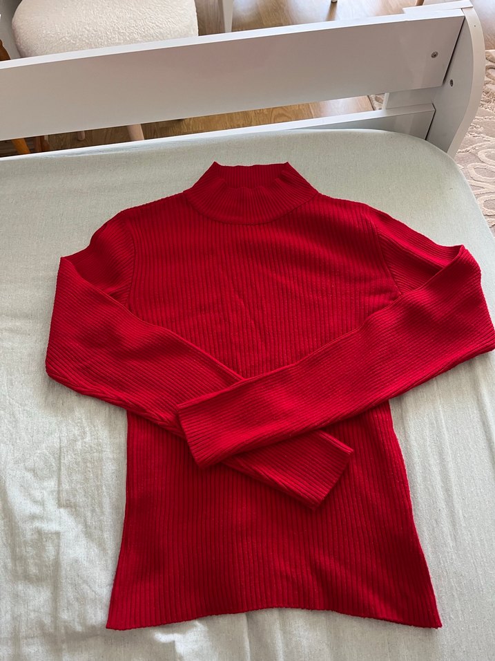 Kırmızı renkte, boğazlı ve uzun kollu, vücuda oturan örme kadın kazak. Yumuşak ve sıcak kumaştan, günlük kullanıma uygun sade tasarım. Kollarında kesikler var❤️ bazı yerleri pamuklu