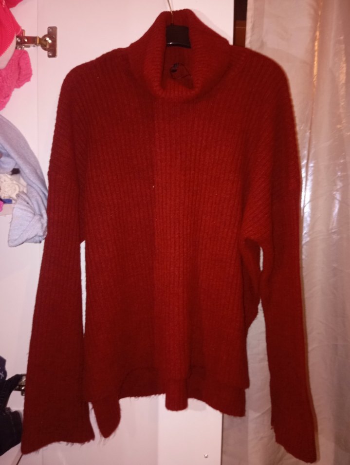 Kırmızı, boğazlı, örgü kadın kazak. Uzun kollu, bol kesim ve midi boyda, yün kumaştan üretilmiştir. Günlük rahat sokak stili için uygundur.