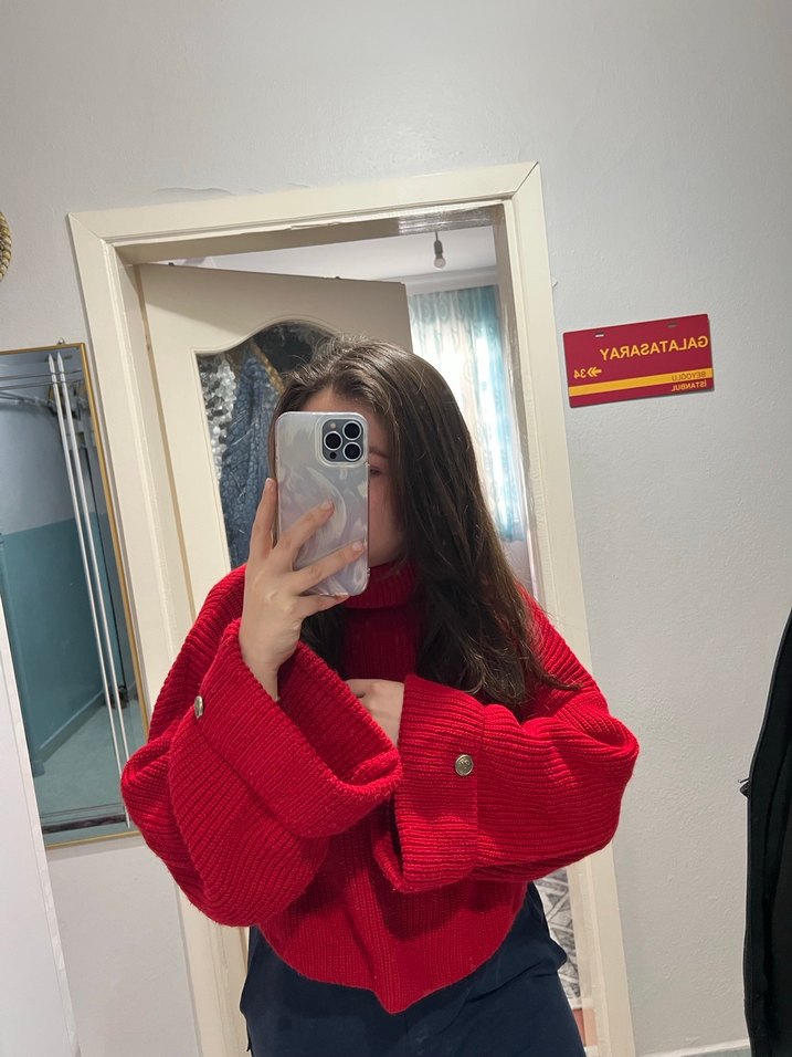 Kırmızı örgü kumaştan, boğazlı ve uzun kollu, salaş kesime sahip rahat bir kadın kazak. Günlük kullanıma uygun midi boyda, desensiz tasarım. Standart bedendir Xl bedene kadar oluyor yenidir