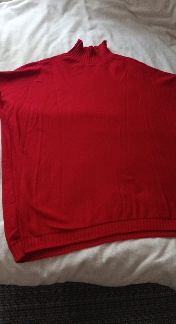 Kadınlar için parlak kırmızı renkte, salaş kesim ve drapeli tasarıma sahip kazak. Boğazlı ve uzun kolludur, yumuşak ve sıcak kumaştan üretilmiştir. Düz ve desensiz, günlük kullanıma uygundur.