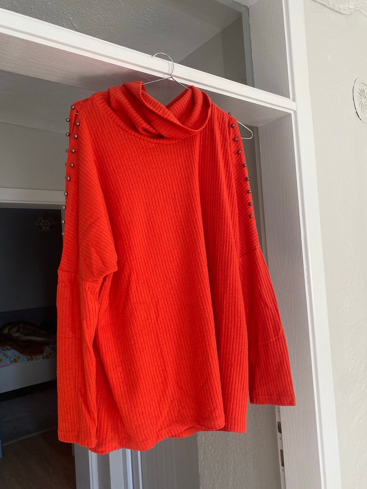 kırmızı renkte, kol detaylı, boğazlı ve uzun kollu, bol kesim midi uzunlukta triko kadın kazak.