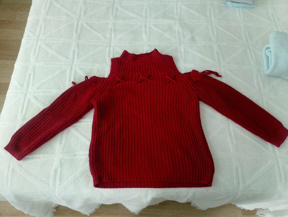 Kırmızı, boğazlı, uzun kollu ve omuzları açık detaylı, triko kadın kazak. Rahat ve şık, günlük kullanıma uygun.