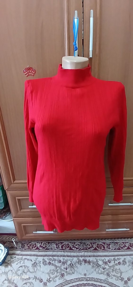 Kırmızı, boğazlı ve uzun kollu, vücuda oturan bu kazak sentetik kumaştan örülmüştür. Günlük kullanıma uygun, rahat ve çağdaş bir tarza sahiptir. dirseğinde lekesi mevcut