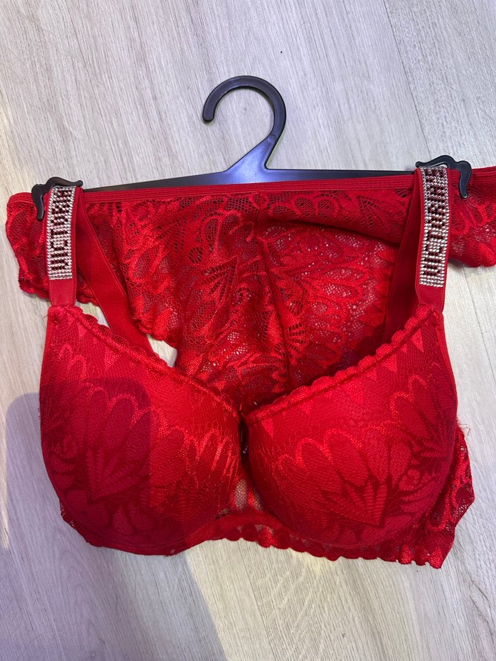 Canlı kırmızı renkte, yumuşak dantelli kumaşa ve süslemeli askılara sahip, rahat ve renkli bohem tarzda sütyen.