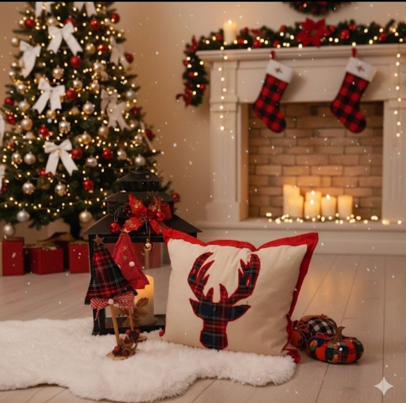 Koyu kırmızı bohem desenli, geyik figürlü dekoratif yastık, mekâna sıcaklık katıyor.