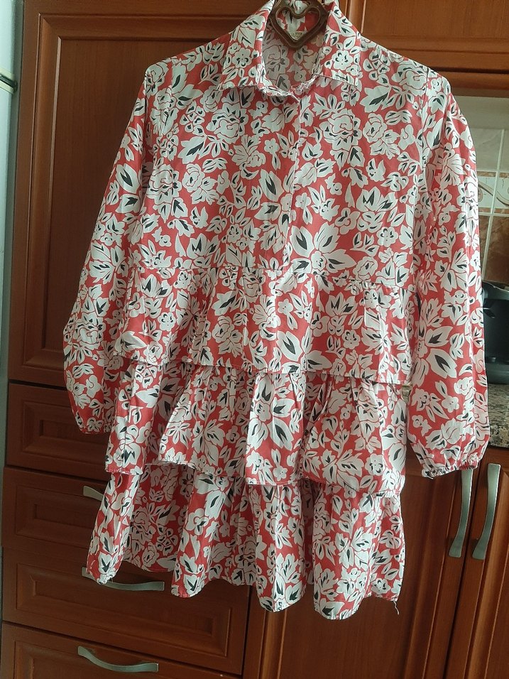 Uzun kollu, yüksek yakalı, kırmızı çiçek desenli ve fırfırlı bohem tarzı bol hamile bluzu.