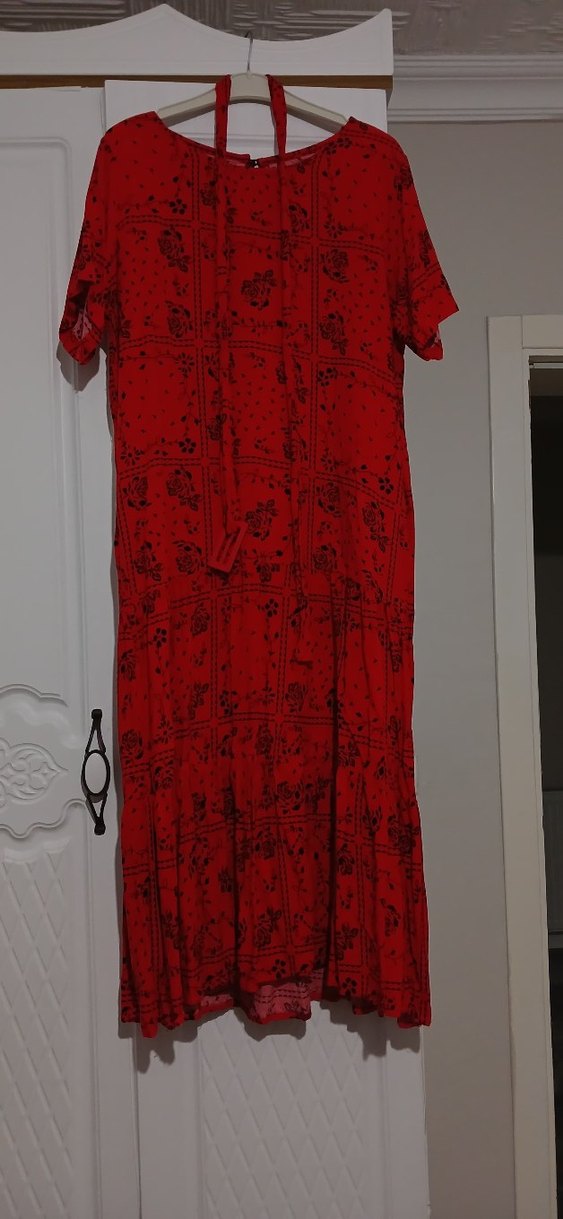 Kırmızı renkli, kısa kollu ve salaş kesimli uzun elbise. Sentetik kumaştan, drapeli ve desenli tasarıma sahiptir, günlük kullanıma uygundur.