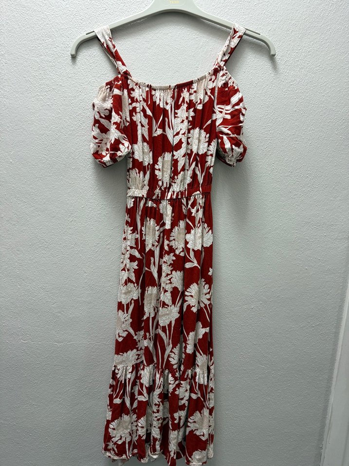 Kırmızı bohem desenli, kısa balon kollu, straplez uzun elbise. Bol kesim ve pile detaylarıyla günlük kullanıma uygundur.