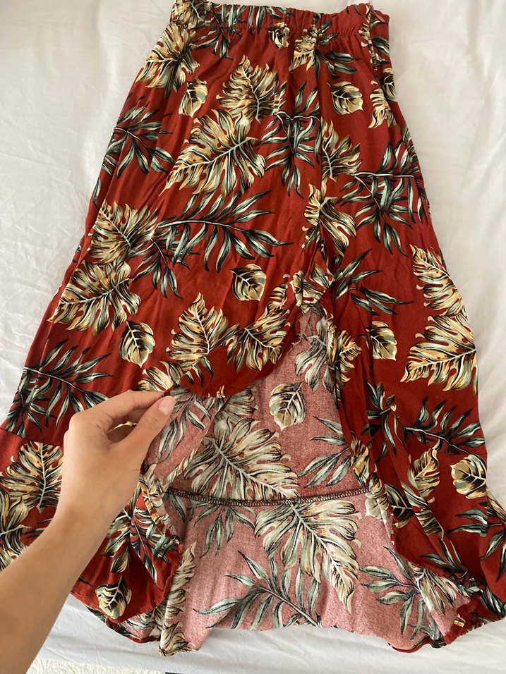 Sentetik kumaştan, kırmızı zemin üzerine bohem tarzı tropikal yaprak desenli, uzun ve bol kesim etek.