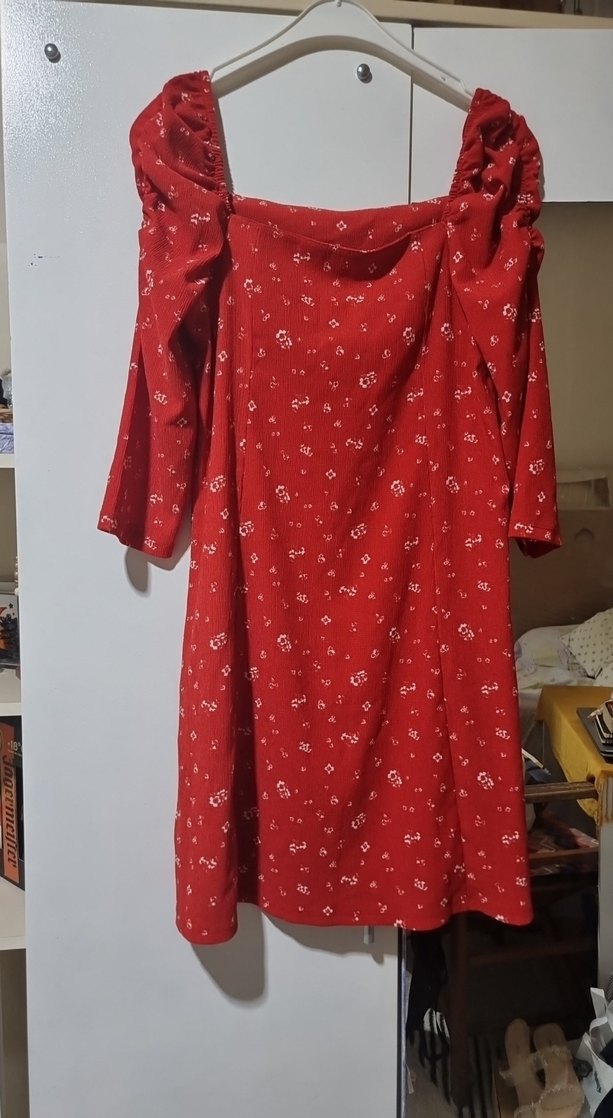 Kırmızı elbise, uzun kollu, kayık yaka ve bol kesimdir. Drapeli detayları ve baskılı deseniyle rahat bir görünüm sunar.