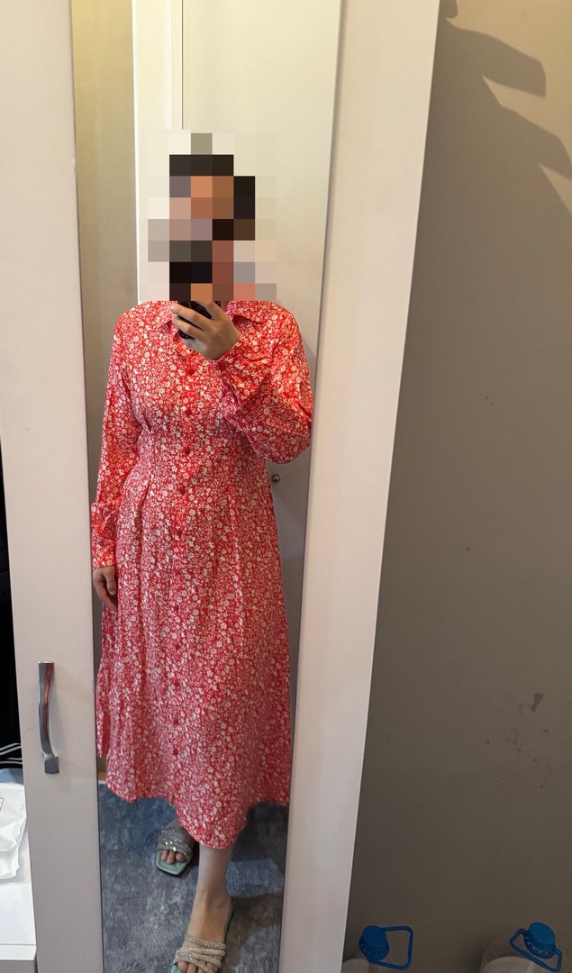 uzun kollu, düğmeli, bol kesim kırmızı bohem tarzda uzun elbise. Hafif kırmızı batik desenli ve sentetik kumaştan üretilmiştir.