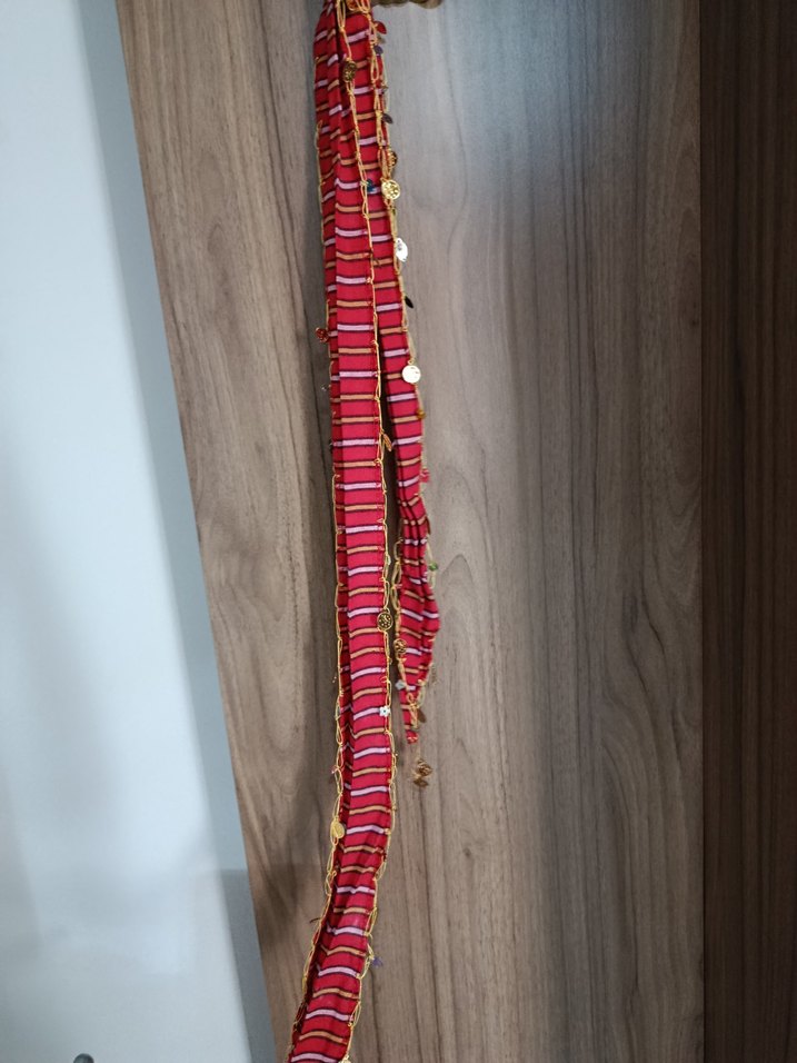 Kırmızı renkli, şerit detaylı ve küçük süslemeler içeren bohem tarzda kadın fularıdır.