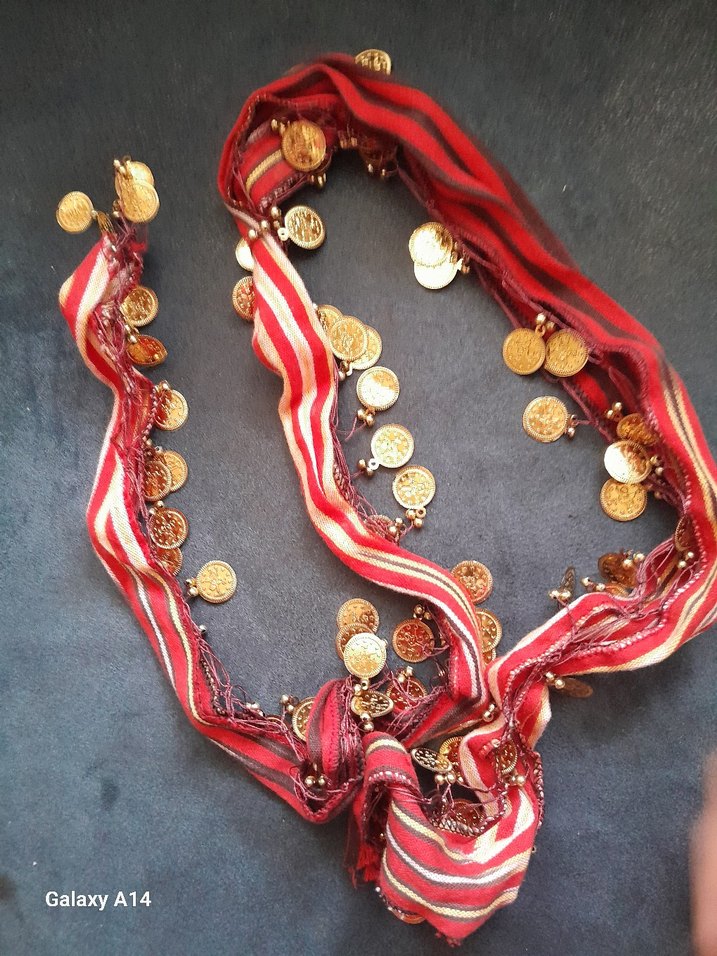 Kırmızı renkli, ipeksi dokulu, kurdele detaylı ve altın renkli madeni süslemelerle bohem tarzı kadın fular.