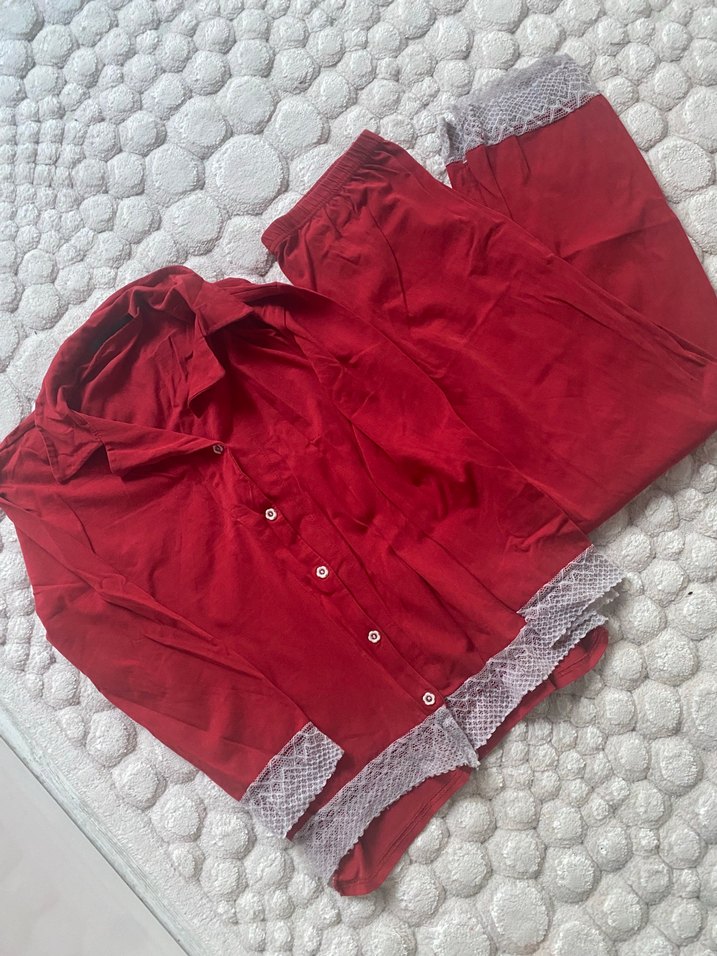Kırmızı renkte, uzun kollu, normal boy midi kadın pijama takımı. Bohem tarzında, rahat kesim ve dantel detaylıdır. Konforlu geceler için uygundur.