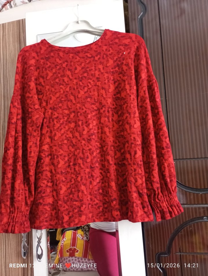 Kırmızı renkte, uzun kollu ve bol kesim triko kazak. Yuvarlak yakalı, renkli tie-dye desenli, bohem tarzda ve rahat bir modeldir.