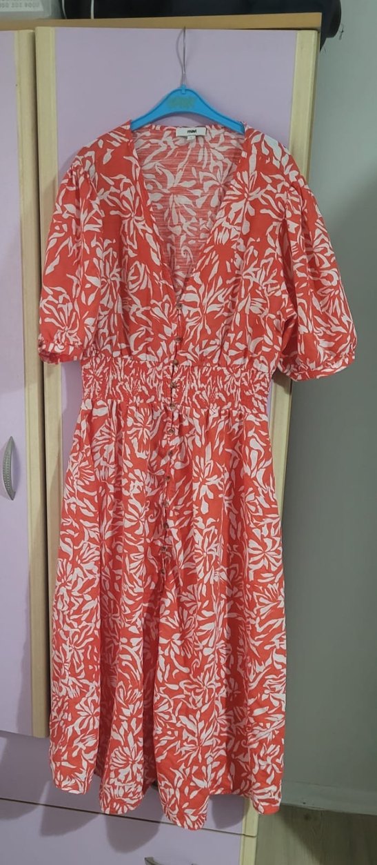Renkli kırmızı bohem elbise, kısa kollu, V yakalı ve düğmeli detaylara sahiptir. bol kesimli ve günlük kullanıma uygundur.