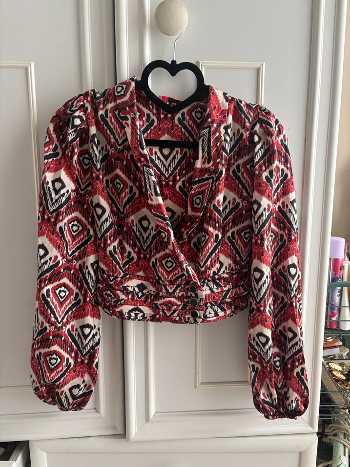 Bu kırmızı bohem bluz, V yaka, uzun kollu ve kemerli bel detayına sahip. Kısa kesim ve tekstil malzemeden üretilmiştir. ✨