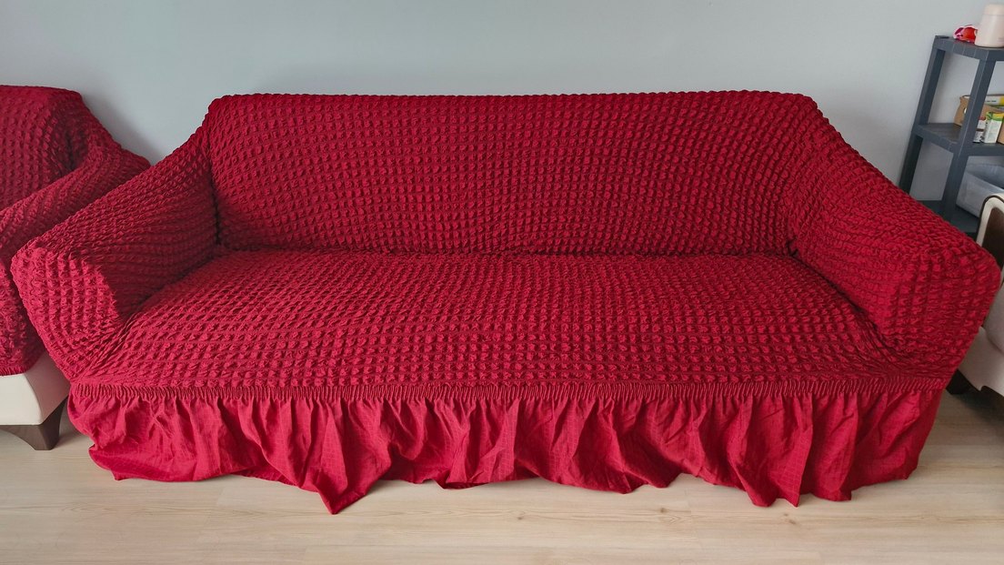 Kırmızı renkte, nakışlı desenli ve bohem tarzda, volanlı kenar detayına sahip renkli koltuk örtüsü. ️