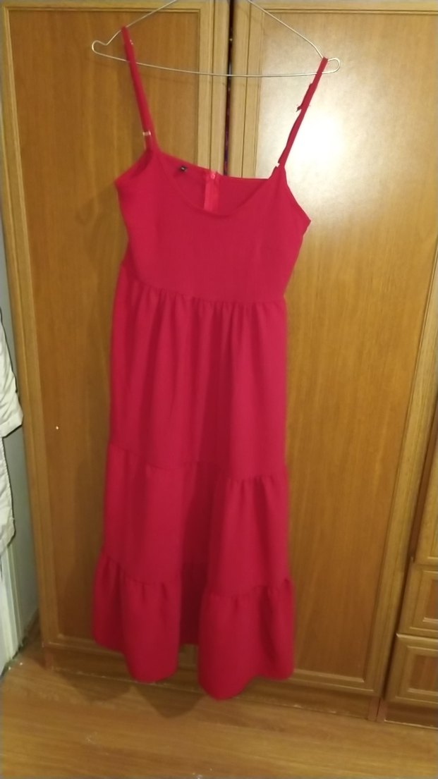 Renkli kırmızı midi elbise, ince askılar ve fırfır detaylarıyla bol kesimdir. Yumuşak sentetik kumaştan yapılmıştır, bohem tarzı için uygundur.