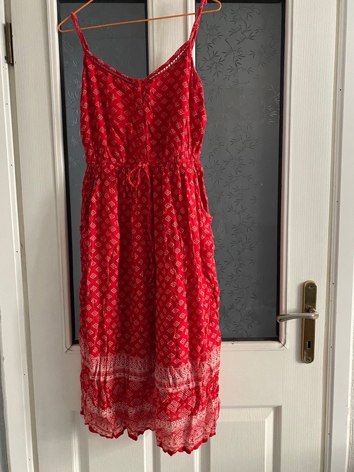 Kırmızı, askılı, salaş kesim ve straplez yakalı bohem tarzda, bağlama detaylı ve batik desenli midi elbise.