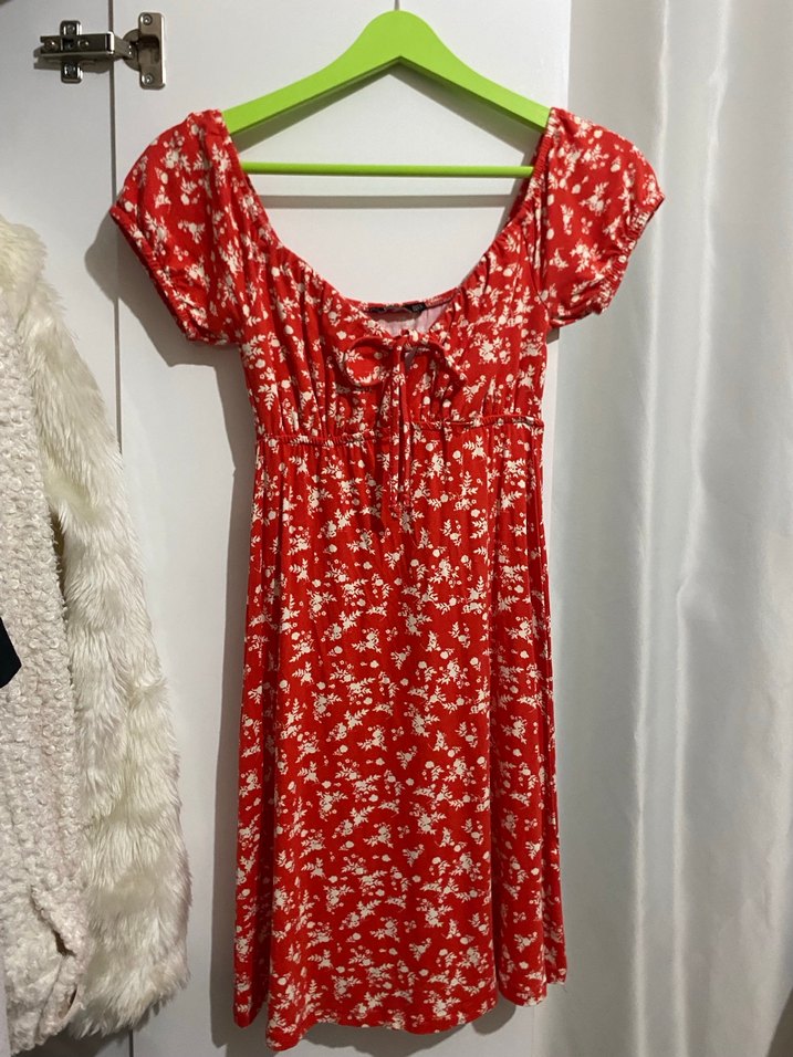 Kırmızı, tek omuz askılı, kayık yaka ve drapeli, renkli batik desenli bohem midi elbise. Yumuşak sentetik kumaştan, günlük kullanım için uygundur.