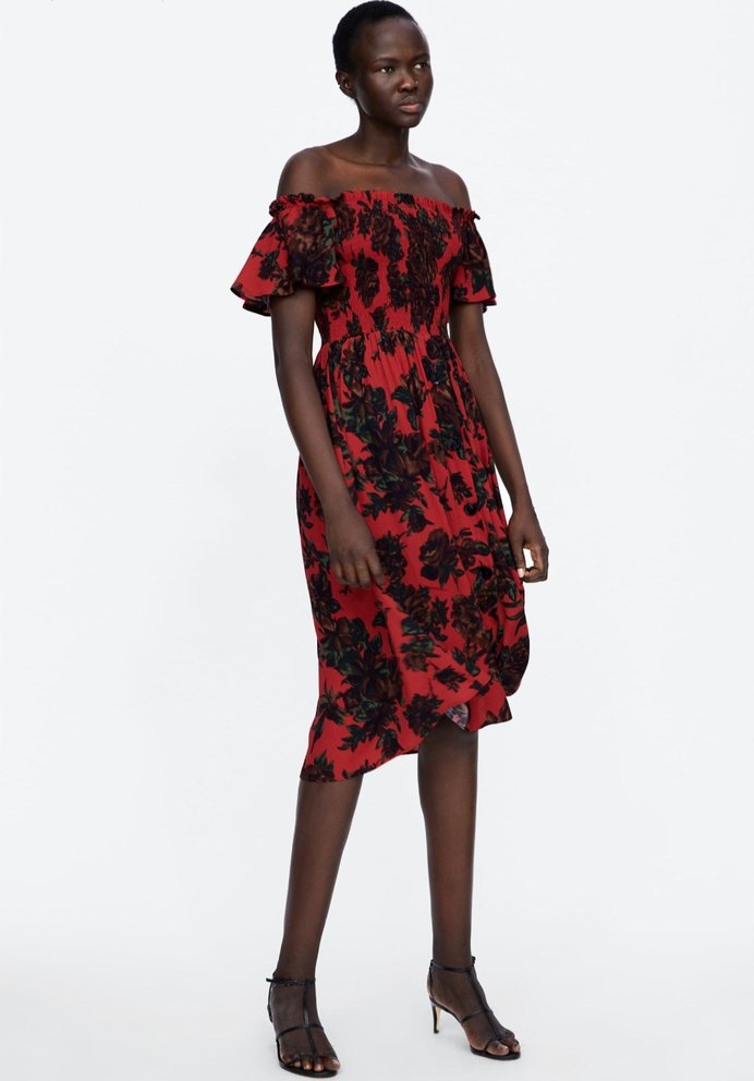 Kırmızı midi boyda, straplez ve bol kesim elbise. Kısa kollu, drapeli ve batik desenli, romantik buluşmalar için bohem tarzda.