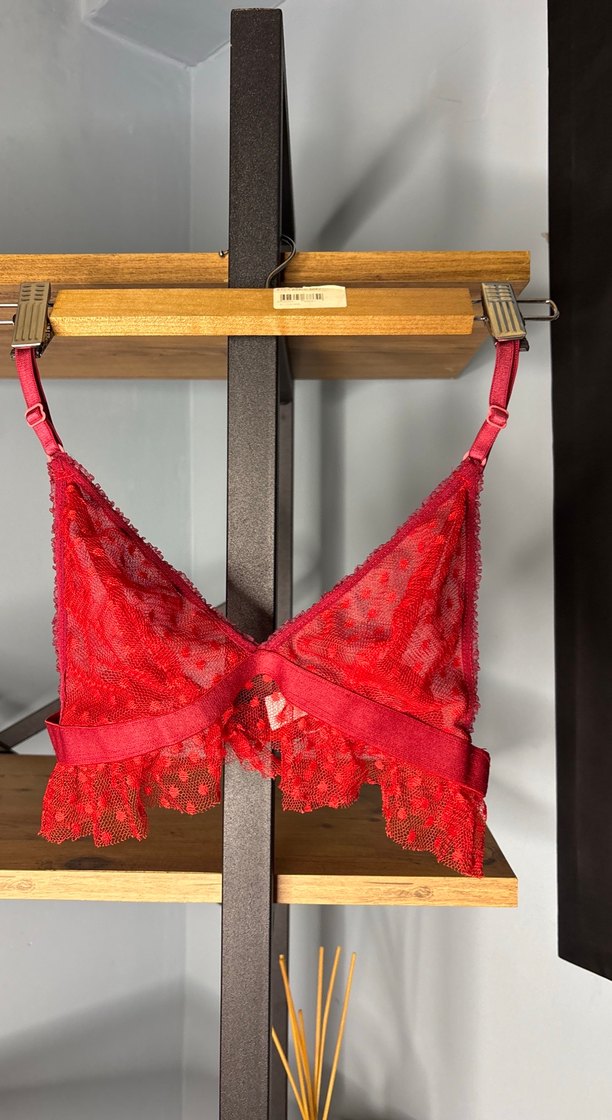 Koyu kırmızı renkte, ayarlanabilir askılı, bohem tarzda mini dantel sütyen. Beden 80