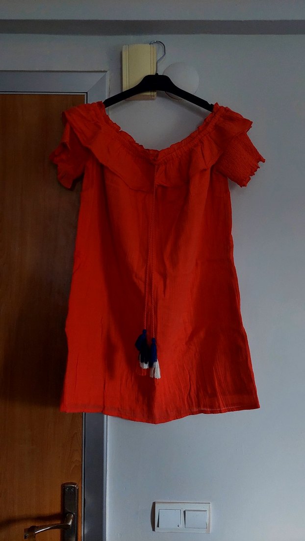 Kırmızı, kısa kollu, straplez yakalı, püsküllü ve bol kesim mini elbise. Şile bezi kumaş ve bohem tarzıyla dikkat çeker.