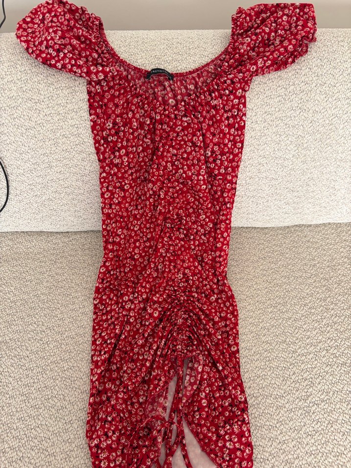 Dar kesim mini elbise, kısa kollu ve kayık yaka detaylıdır. Yumuşak sentetik kumaştan yapılmış, kırmızı koyu tonlu batik desenlidir, bohem tarzı yansıtır.