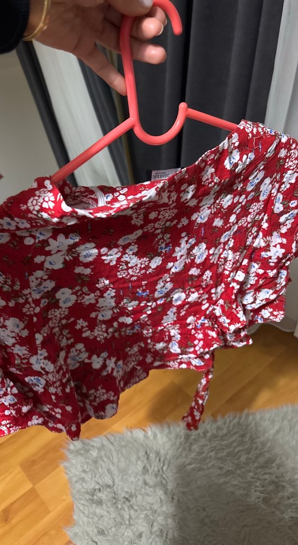 Kırmızı, çiçek desenli bohem mini hamile eteği, fırfırlı ve bol kesimdir. Yumuşak sentetik kumaştan yapılmıştır.