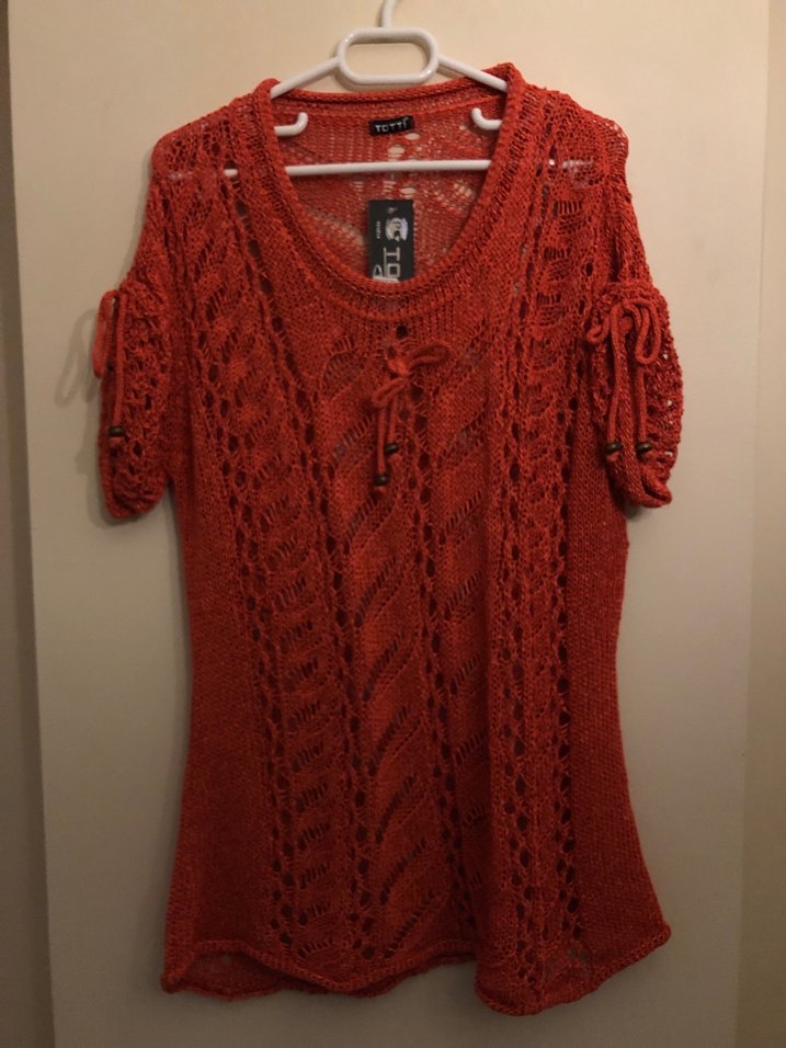 Parlak kırmızı, kısa kollu, yuvarlak yakalı, bol kesim örgü kazak. Bohem tarzında, günlük kullanıma uygun. ✨