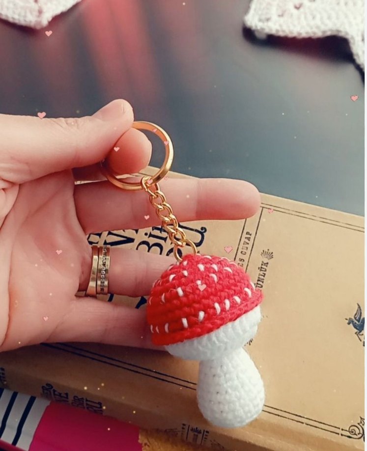 Kırmızı örme mantar ve püskül detaylı, renkli bohem tarzda anahtarlık. Rahat ve retro bir hava katar.
