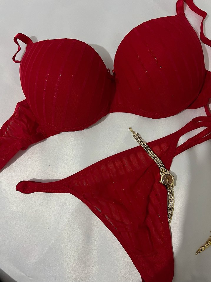 Parlak kırmızı renkte, bohem tarzda, desen içermeyen sütyen ve zincir detaylı tanga seti. 80-85-90 bedenleri mevcuttur. Çizgili/Parlak Hijyen nedeniyle iade kabul edilememektedir. Ürünler sıfırdır.