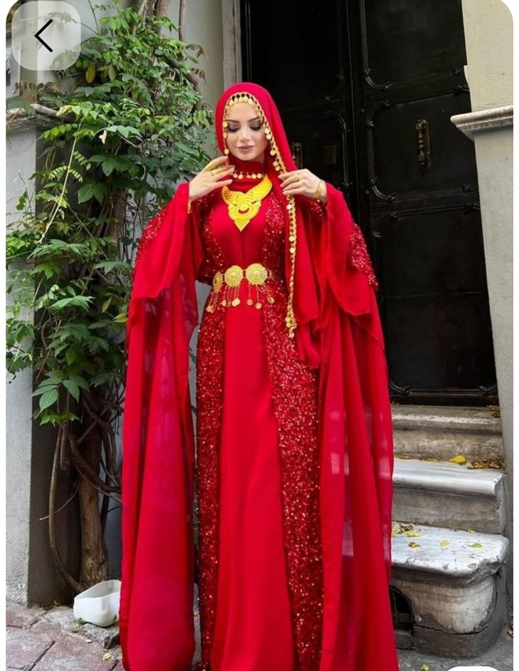 Uzun, bol kesim kırmızı henna elbise, yüksek yakalı ve uzun kollu. Etnik desenli ve drapeli tasarım, düğünler ve mütevazı tarz için uygundur. yöresel kıyafet düğünlerde nişanda kına gibi özel günlerde rahatlıkla kullanılıabilir esnek yapısı ile çoğu bedene uyum sağlar zarif güzel ve şık isteğe bağlı altın detaylı şal hediye