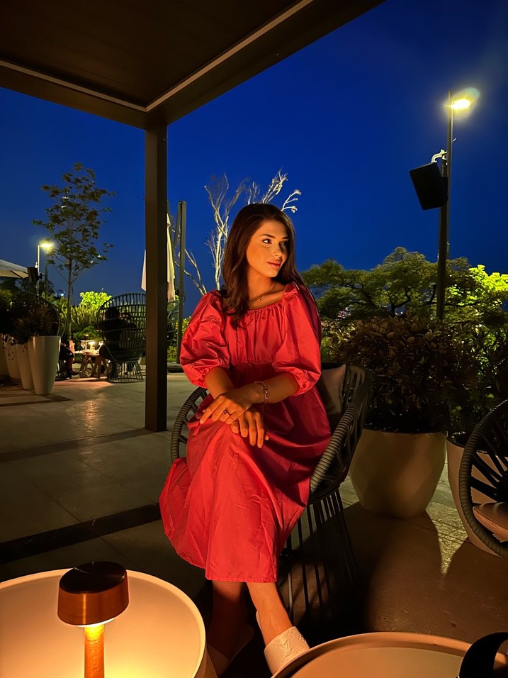 Parlak kırmızı renkte, bol kesim ve kayık yaka ile uzun elbise. İnce askılı, ipeksi kumaşı romantik akşamlar için uygun, baskılı desene sahip.
