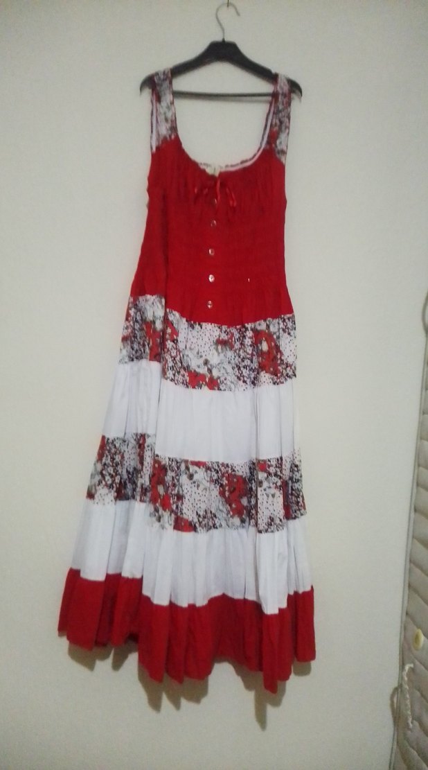 Renkli kırmızı bohem uzun elbise, salaş kesim ve fırfır detaylara sahiptir. Askısız, kolsuz ve batik desenlidir, parti için uygundur.