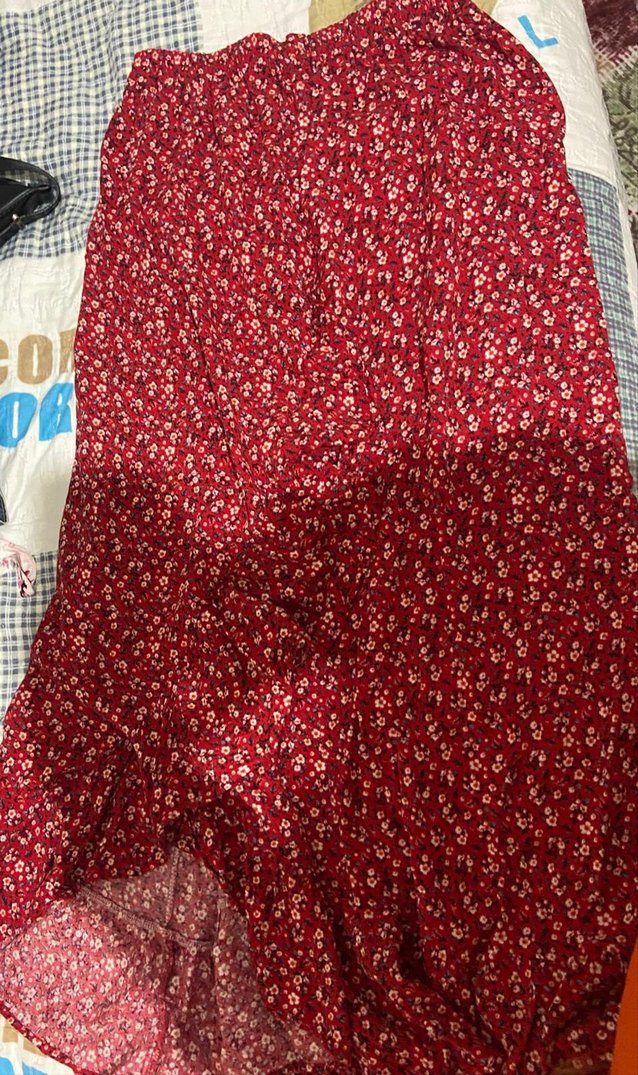 kırmızı renkte, küçük çiçek desenli ve fırfırlı detaylara sahip, bohem tarzda uzun ve dar kesim etek. Günlük kullanım için uygun yumuşak kumaş.
