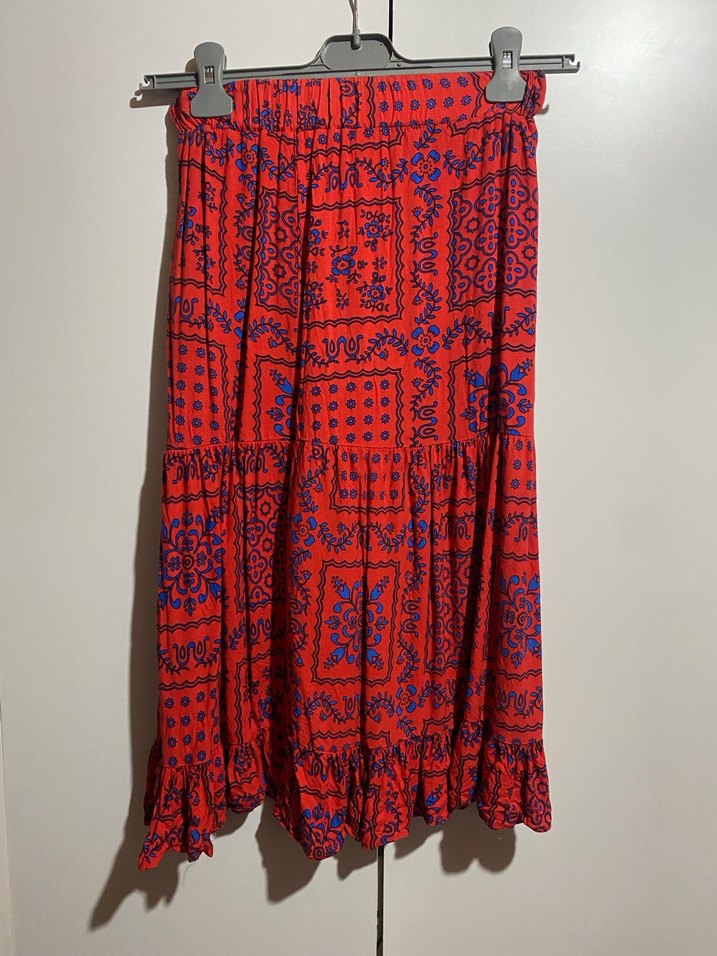Kırmızı renkli, uzun bohem etek, renkli batik desen ve fırfır detaylarına sahiptir. Yumuşak dokulu kumaştan üretilmiş, rahat günlük kullanım için bol kesimdir.